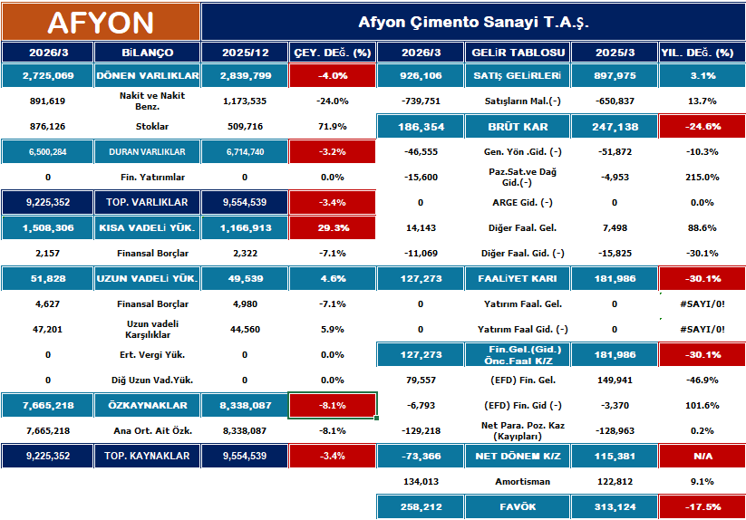 Genel olarak değerlendirildiğinde Afyon Çimento’nun finansal yapısı güçlü kalmaya devam ederken, operasyonel kârlılıkta belirgin bir zayıflama yaşandığı görülüyor. Artan maliyetler ve stok birikimi kârlılığı aşağı çekerken, güçlü likidite ve düşük borçluluk şirketin en önemli destekleyici unsurları olarak öne çıkıyor. Önümüzdeki dönemde maliyet kontrolü ve satışların daha sağlıklı bir şekilde kârlılığa yansıtılması, şirketin finansal performansı açısından belirleyici olacak.