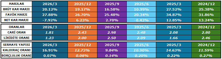 Buna karşın likidite tarafında şirketin güçlü görünümünü koruduğu görülüyor. Cari oran 1,81, likidite (asit-test) oranı ise 1,23 seviyesinde gerçekleşti. Bu oranlar, şirketin kısa vadeli yükümlülüklerini karşılama kapasitesinin yeterli olduğunu ve nakit akışı açısından ciddi bir risk bulunmadığını ortaya koyuyor.