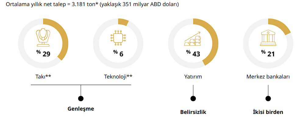 Çin ve Hindistan halkının gelir seviyesinin artması ile kültürel yapısının etkisi ile takıya olan ilginin artması ve 2021 sonrası Merkez Bankalarının kendilerini korumak adına, rezervlerini ABD tahvilinden altına kaydırması ve özellikle 2025 sonrasında türev araçlar ile fonların (ETF) yatırım/trade maksatlı olarak ciddi oranda pozisyon artırması; altındaki mevcut tablonun oluşmasına sebebiyet verdi.