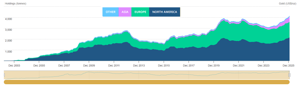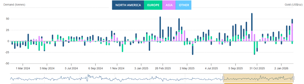 Tabii ki unutulmaması gereken bir husus var; her aşırılaşma arkasından da volaitiliteyi otomatik olarak taşır. 2025’in son çeyreği ile birlikte Amerika ve Asya kaynaklı fonların (ETF) el artırması sonucu hareketlenen altın fiyatı, ünlü 29 Ocak çöküşünde Avrupa kaynaklı ETF’ler satış yaparken, Asya ve Amerika kaynaklı fonların satış yapmak bir yana alıma devam ettikleri ner olarak görülmektedir.