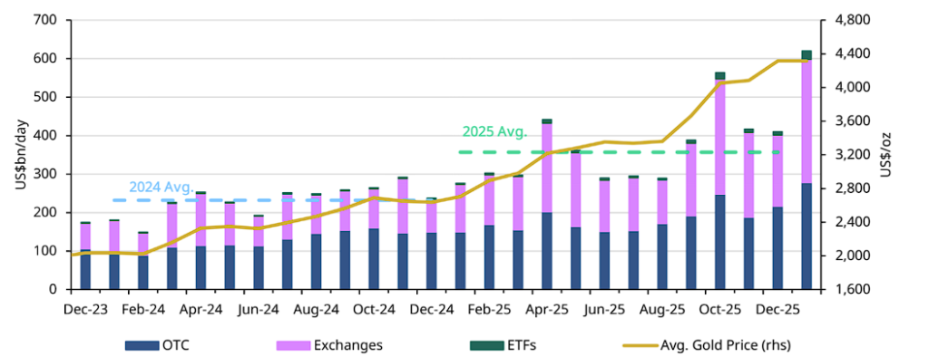 Bunlar ilave olarak türev araçlarda da ciddi bir hacim artılı yaşandı. Küresel altın piyasası işlem hacimleri Ocak ayında ortalama 623 milyar ABD doları/gün seviyesine yükselerek aylık bazda %52’lik bir artış gösterdi ve 2025 ortalamasının %72 üzerinde yer aldı. Bu hacim artışı da doğal olarak arkasından, kar almak isteyen bireysel/kurumsal yatırımcıların işlemleri ile piyasanın dönemsel bile olsa volatil bir seyir izlemesine yol açtı.