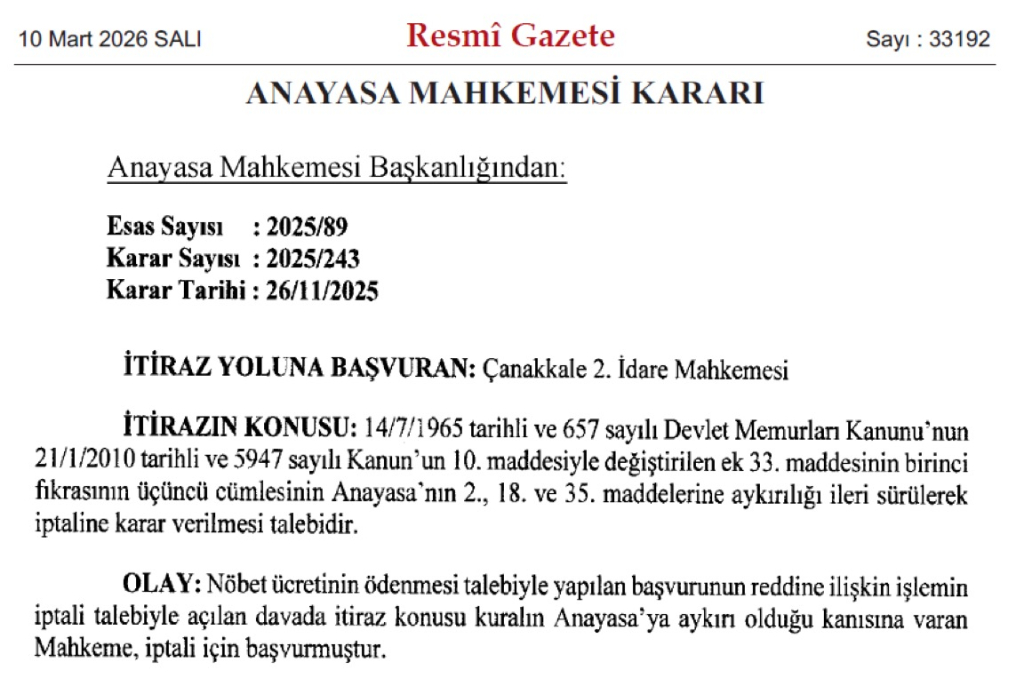Anayasa Mahkemesi, söz konusu düzenlemeyi değerlendirerek belirli bir saatten sonra nöbet ücretinin ödenmemesinin Anayasa’ya aykırı olduğuna hükmetti. Mahkeme kararını 26 Kasım 2025 tarihinde oybirliğiyle aldı.