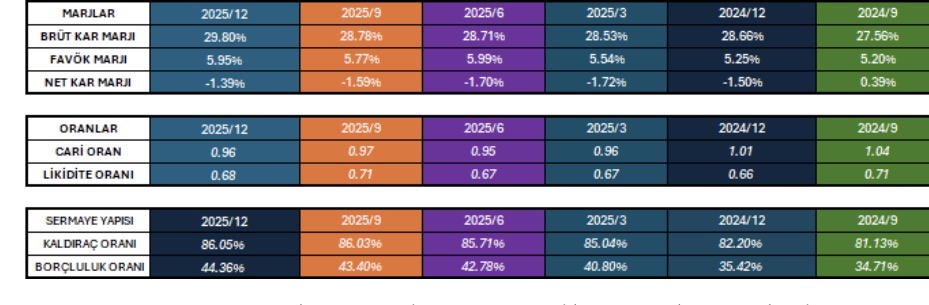 • Marjlar: Brüt kar marjı %29,80 ile son dönemlerin en yüksek seviyesinde. Ancak Net Kar Marjı –%1,39 seviyesinde seyrederek negatif bölgede kalmaya devam ediyor.