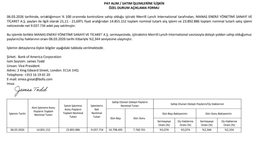 3. Bank of America’dan MANAS’ta Yüklü Satış: Payı %5’in Altına Düştü