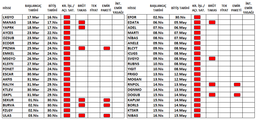 - Niğbaş Niğde Beton (#NIBAS.E) paylarında 16/04/2026 tarihli işlemlerden (seans başından) 15/05/2026 tarihli işlemlere (seans sonuna) kadar brüt takas uygulanacak..