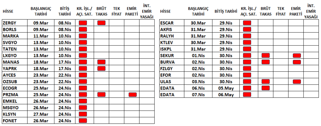 EDATA paylarının VBTS kapsamına alınması ile listesi güncellendi. Aşağıdaki tabloda, Borsa İstanbul tarafından tedbir konulmuş olan pay senetleri, bitiş tarihleri ve uygulanan tedbirler.