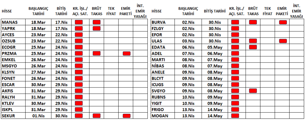 - Frigo Pak Gıda (#FRIGO.E) ve Mogan Enerji (#MOGAN.E) payları 13/04/2026 tarihli işlemlerden (seans başından) 12/05/2026 tarihli işlemlere (seans sonuna) kadar açığa satışa ve kredili işlemlere konu edilemeyecek.
