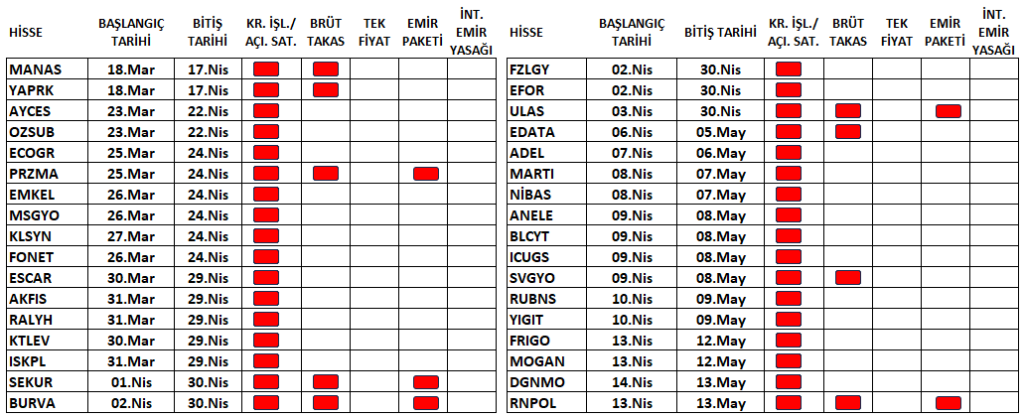 DGNMO ve RNPOL paylarının VBTS kapsamına alınması ile listesi güncellendi. Aşağıdaki tabloda, Borsa İstanbul tarafından tedbir konulmuş olan pay senetleri, bitiş tarihleri ve uygulanan tedbirler.