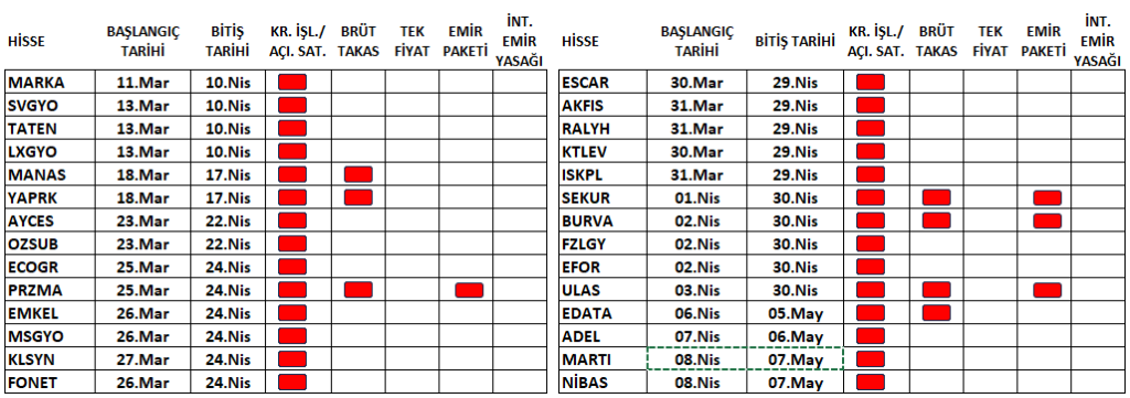 - MARTI ve NIBAS payları 08/04/2026 tarihli işlemlerden (seans başından) 07/05/2026 tarihli işlemlere (seans sonuna) kadar açığa satışa ve kredili işlemlere konu edilemeyecektir.