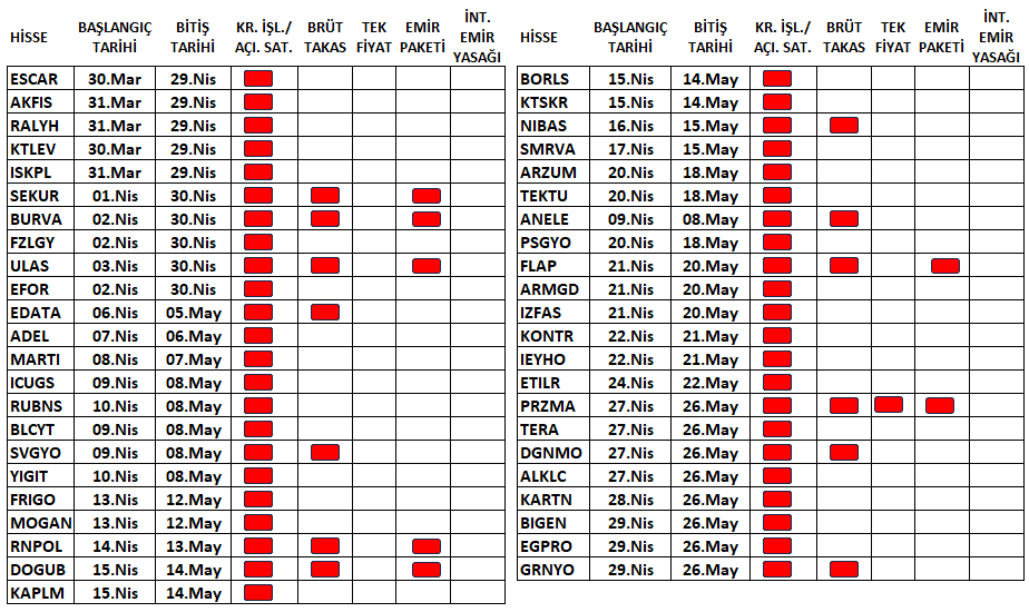 - Garanti Yatırım Ortaklığı (#GRNYO.E) payları 29/04/2026 tarihli işlemlerden (seans başından) 26/05/2026 tarihli işlemlere (seans sonuna) kadar emir paketi tedbiri ile işlem görecek.