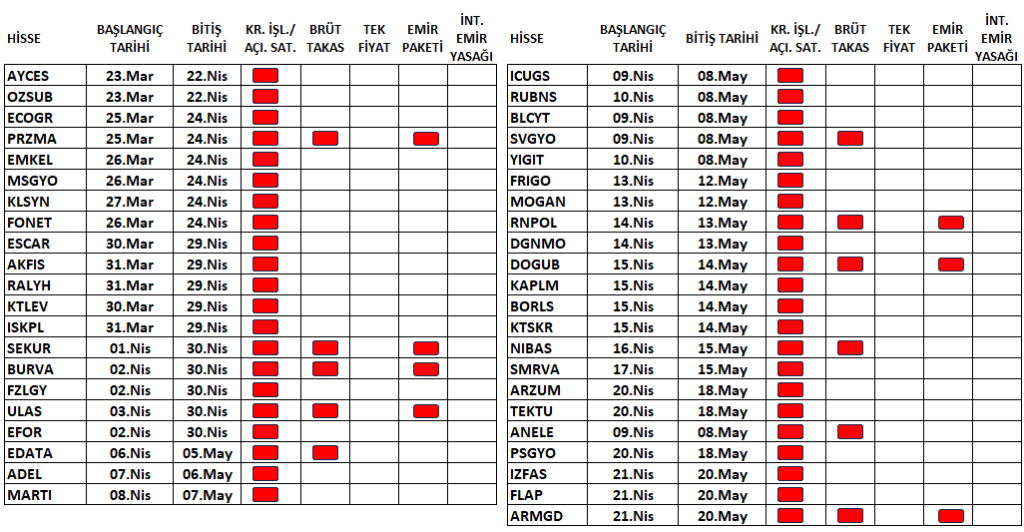 - FLAP payları 21/04/2026 tarihli işlemlerden (seans başından) 20/05/2026 tarihli işlemlere (seans sonuna) kadar emir paketi tedbiri ile işlem görecek.