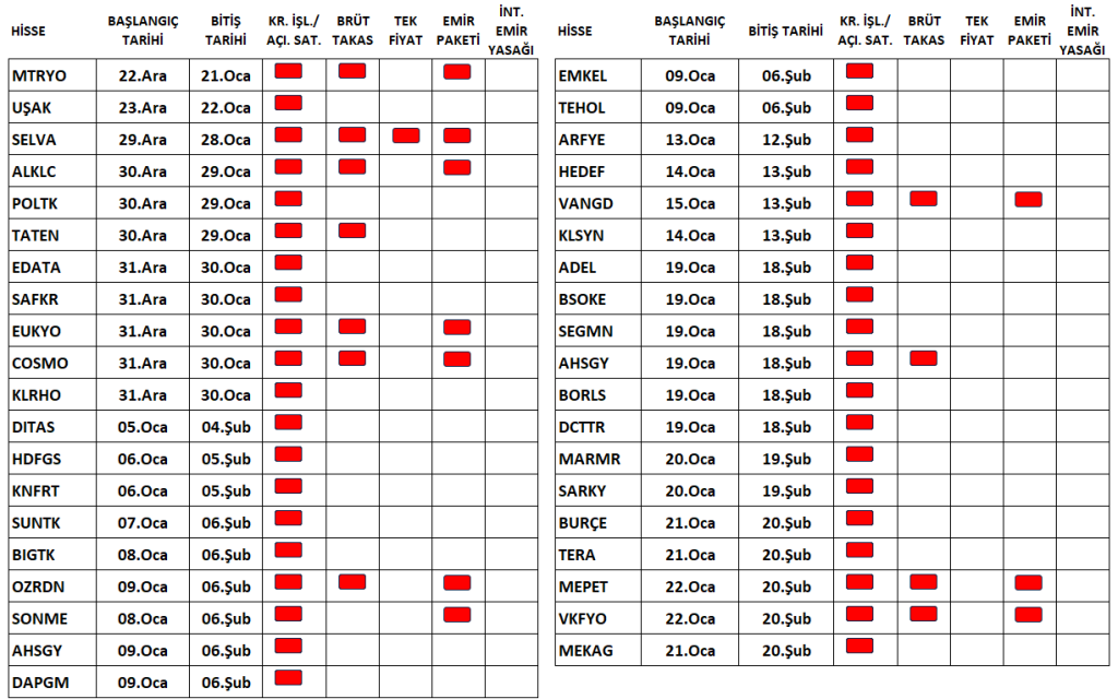 - Metro Petrol ve Tesisleri (#MEPET.E) payları 22/01/2026 tarihli işlemlerden (seans başından) 20/02/2026 tarihli işlemlere (seans sonuna) kadar emir paketi tedbiri ile işlem görecek.