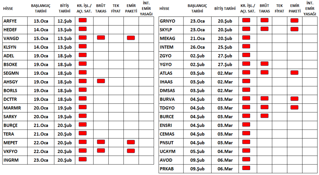 6 Şubat seans sonu ile beraber SUNTK.E, BIGTK.E, OZRDN.E, SONME.E, AHSGY.E, DAPGM.E, EMKEL.E ve TEHOL.E paylarında uygulanan tedbirlerinde sona ermesi ile VBTS kapsamındaki hisselerin listesi güncellendi.