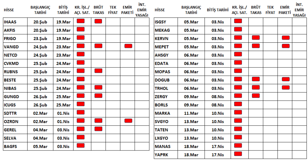 SMART.E paylarına uygulanan tedbirler 18 Mart tarihi ile kaldırıldı. VBTS kapsamında bulunan şirketler listesi güncellendi. Aşağıdaki tabloda, Borsa İstanbul tarafından tedbir konulmuş olan pay senetleri, bitiş tarihleri ve uygulanan tedbirler.