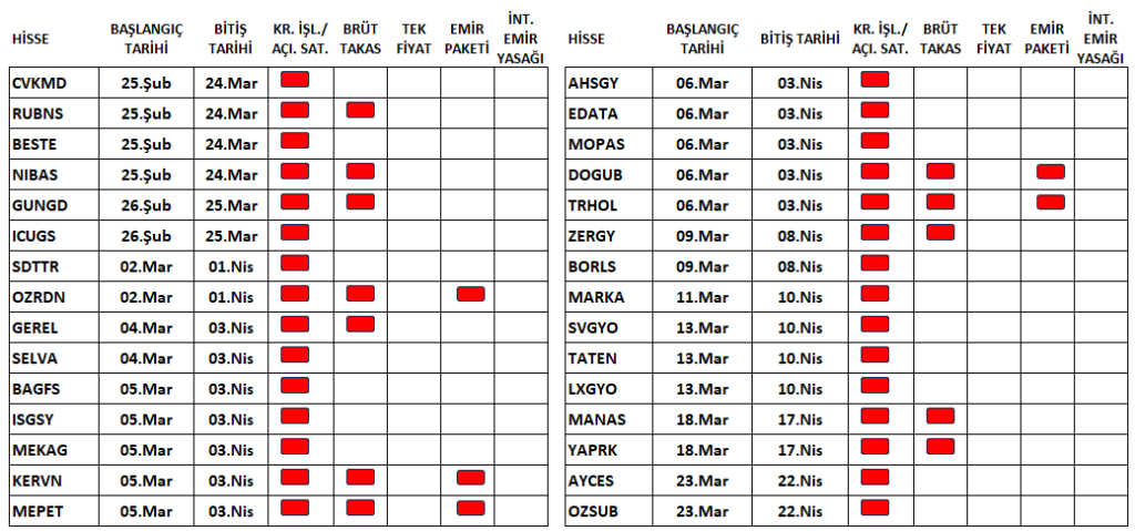 VANGD.E ve NETCD.E paylarına uygulanan tedbirler 23 Mart tarihi ile kaldırıldı. VBTS kapsamında bulunan şirketler listesi güncellendi. Aşağıdaki tabloda, Borsa İstanbul tarafından tedbir konulmuş olan pay senetleri, bitiş tarihleri ve uygulanan tedbirler.