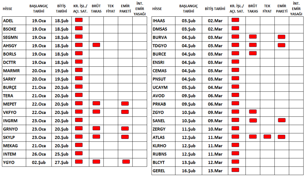 - Gersan Elektrik (#GEREL.E) payları 16/02/2026 tarihli işlemlerden (seans başından) 13/03/2026 tarihli işlemlere (seans sonuna) kadar açığa satışa ve kredili işlemlere konu edilemeyecek.