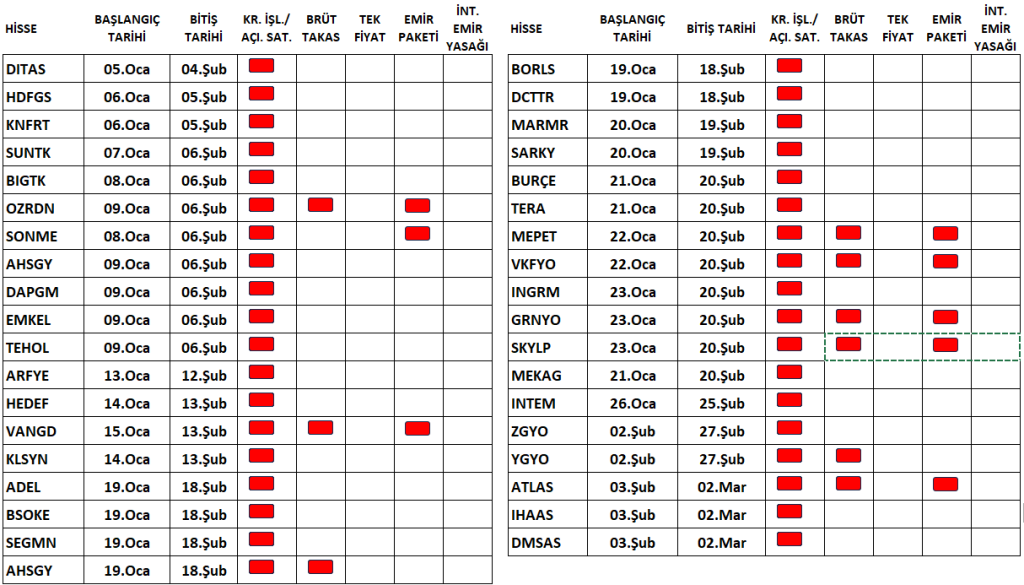 Bu hisselerle beraber VBTS kapsamına alınan şirketler listesi de güncellendi. Aşağıdaki tabloda, BIST veya SPK tarafından tedbir konulmuş olan pay senetleri, bitiş tarihleri ve uygulanan tedbirleri görebilirsiniz.