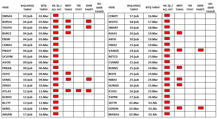 Yeşil Gayri Menkul Yatırım Ortaklığı (YGYO.E) paylarına uygulanan tedbirler 27 Şubat tarihi ile kaldırıldı. MANAS, SDTTR VE OZRDN paylarının VBTS kapsamına alınması ile VBTS listesi de güncellendi. Aşağıdaki tabloda, Borsa İstanbul tarafından tedbir konulmuş olan pay senetleri, bitiş tarihleri ve uygulanan tedbirler.