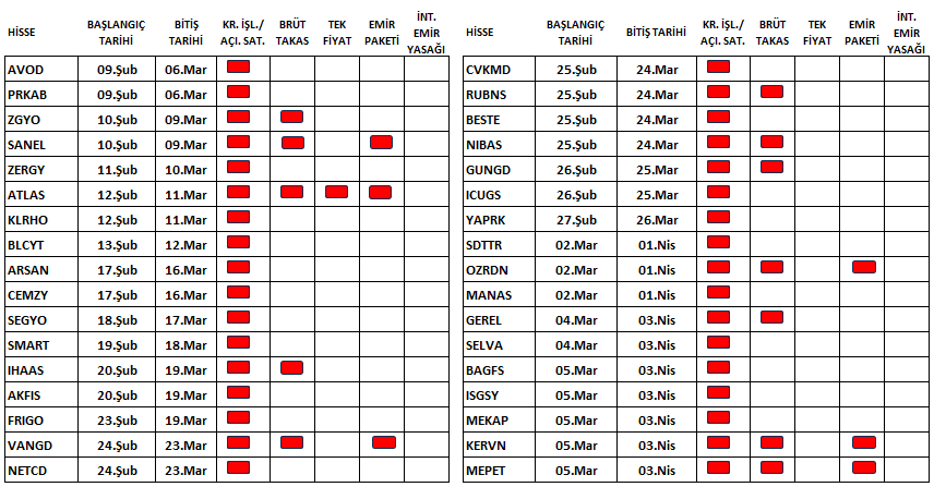 UCAYM paylarına uygulanan tedbirler 04 Mart tarihi ile kaldırıldı. BAGFS, ISGSY, MEKAG, KERVN ve MEPET paylarının VBTS kapsamına alınması ile listesi güncellendi. Aşağıdaki tabloda, Borsa İstanbul tarafından tedbir konulmuş olan pay senetleri, bitiş tarihleri ve uygulanan tedbirler.