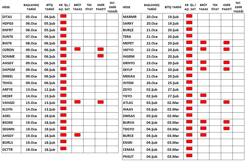 Bu hisselerle beraber VBTS kapsamına alınan şirketler listesi de güncellendi. Aşağıdaki tabloda, BIST veya SPK tarafından tedbir konulmuş olan pay senetleri, bitiş tarihleri ve uygulanan tedbirleri görebilirsiniz.