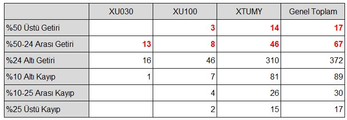 Sadece 84 adet hisse bu yükselişe eşlik edebilmiş olduğuna göre, bu yükselişin pek de yaygın olarak yaşandığını söylemek doğru olmayacaktır.