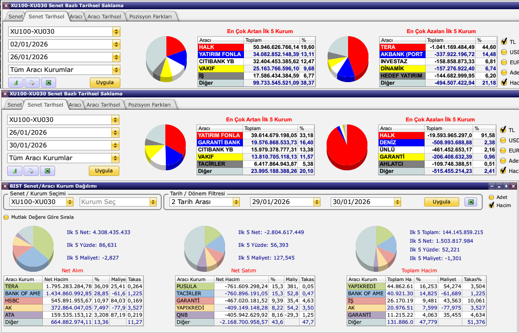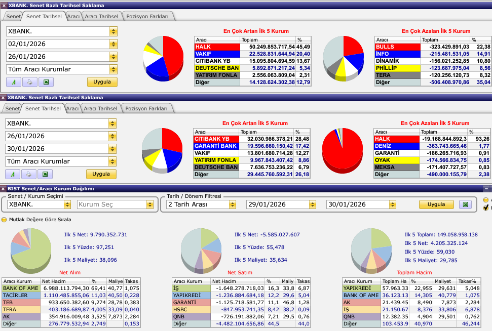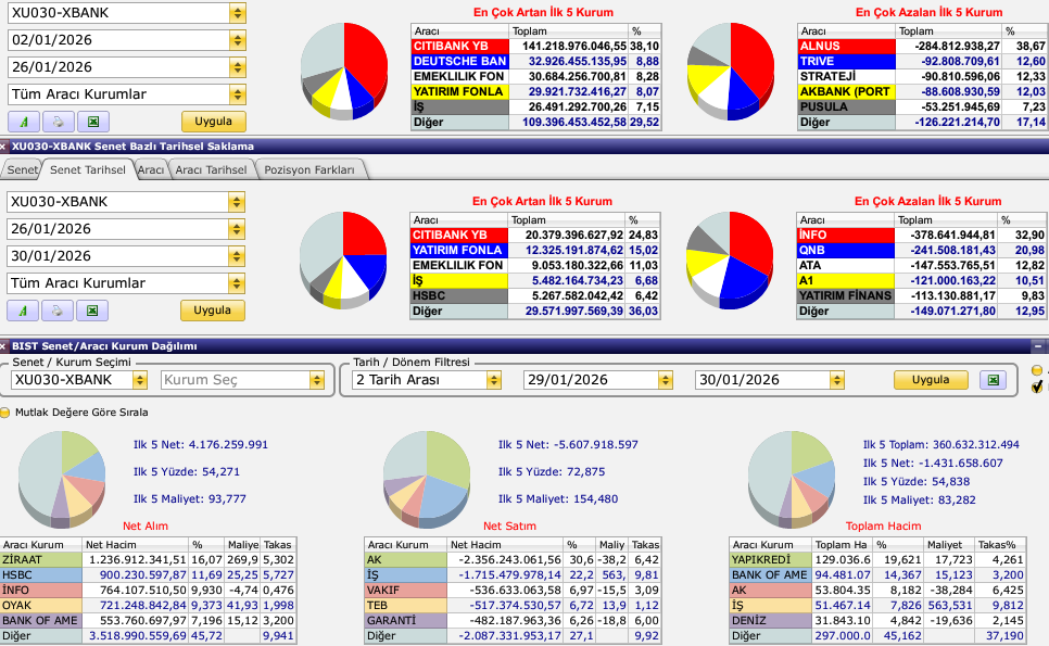 Hacim bazlı olarak (işlem yapılan hisse miktarı*fiyatı) baktığımızda hali hazırda korkutuu bir tablo çıkmıyor karşımıza ama özellikle son iki gün için AK ve İş satışlarını izlemekte fayda var. Bunların Yabancı ve Fon çıkması durumunda az da olsa temkinli tarafa geçmek gerekir diye düşünen taraftayın