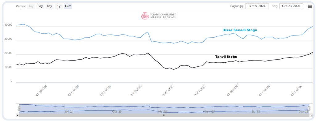 Takas değişimlerinin yanı sıra bir de para girişinin takibi maksatlı olarak Yurtdışı yerleşiklerin Tahvil ve Hisse senedine ilgisini izlemekte fayda var. Her iki veride de, Mayıs 2025 sonrası her ne kadar enflasyondaki düşüşe paralel olarak nispi bir yükselme olsa da, bu ilginin enflasyon verisi ile terse dönebileceği e unutulmamalıdır.