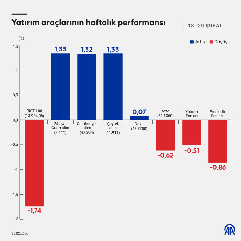 Borsa İstanbul’da işlem gören hisse senetleri haftalık bazda ortalama yüzde 1,74, avro/TL yüzde 0,62 değer kaybederken, altının gram fiyatı yüzde 1,33, dolar/TL yüzde 0,07 değer kazandı.