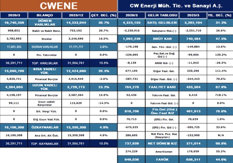 CW Enerji, 2026 yılının ilk çeyreğinde net karını ikiye katlayarak rekor marjlara ulaşırken, büyüme ivmesini sağlam bilanço yapısıyla taçlandırmıştır.
