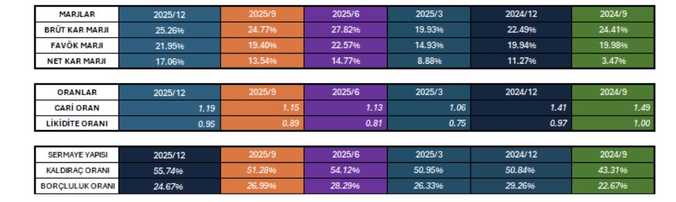 • Marjlar: Brüt kar marjı (%25,26) ve FAVÖK marjı (%21,95) son bir yılın en yüksek seviyelerine ulaşmış. Özellikle Net Kar Marjı %8,88’den %17,06’ya fırlamış; bu, şirketin her satıştan aldığı kar payını ikiye katladığını gösteriyor.