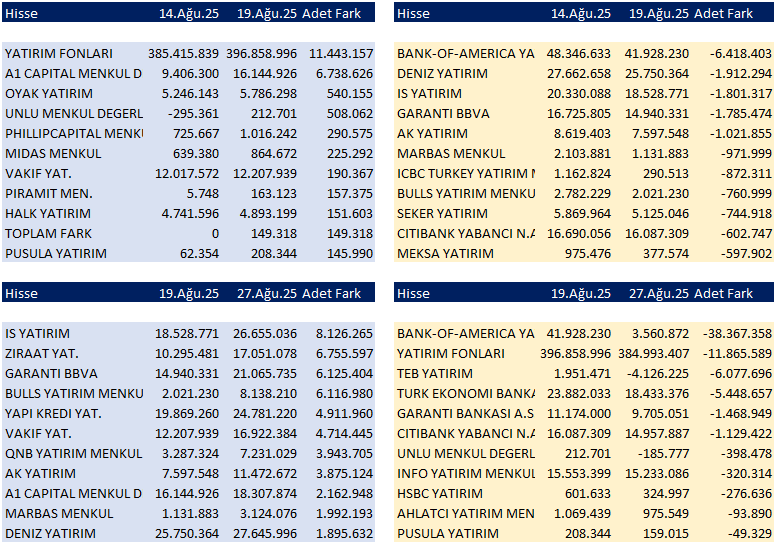 14 Ağustos 2025 – 27 Ağustos 2025 tarihleri arasında BOFA hisse satarken, Yatırım fonlarının alımı dikkat çekiyor. (acaba kimin eli rahatlatıldı?)