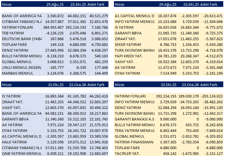 29 Ağustos 2025 23 Ekim arasında ise BOFA ve CİTY alımlarının başı çekerken, 23 Ekim 2025 – 23 Ocak 2026 tarihleri arasında İş yatırım, Ziraat, Vakıf ve BOFA alımda, satıcı ise nerdeyse tek, Yatırım Fonları.