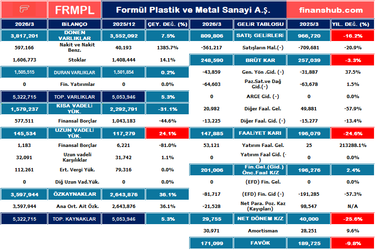 Formül Plastik (FRMPL) şirketinin 2026/3 bilançosunu bir “halka arz” perspektifiyle incelediğimizde, tablolar halka arzdan gelen taze kaynağın etkilerini net bir şekilde yansıtmaktadır.