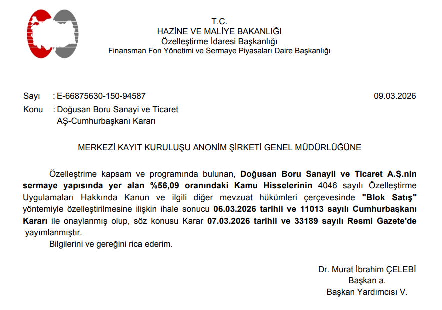 Özelleştirme kapsamındaki Doğusan Boru Sanayii ve Ticaret A.Ş. (DOGUB) ile ilgili 10 Ekim 2025 yılında ilana çıkılmasının ardından 6 firma 24 Kasım 2025’deki son teklif verme gününe kadar teklifte bulunmuş ve 2 firmadan nihai pazarlık görüşmeleri için teklif alınmıştı. Ancak verilen teklifler yeterli bulunmayarak ihale sonlandırılmıştı.