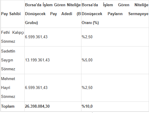 “Şirketimiz sermayesini temsil eden 263.980.843 adet payın %10’una tekabül eden 26.398.084,30 adet B grubu payın borsada işlem görebilir niteliğe dönüştürülmesine karar verilmiştir.
