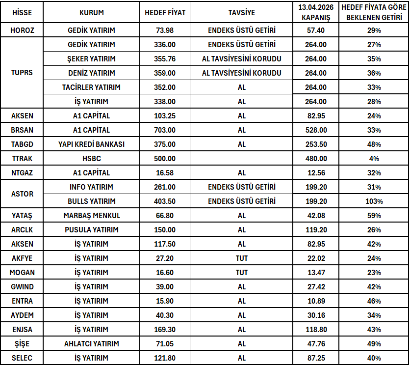 01 -14 Nisan arası açıklanan hedef fiyatlarda en çok dikkat çeken TUPRS hisse senedi oldu.