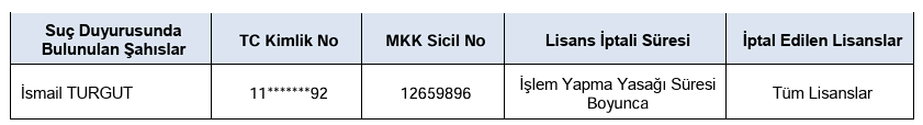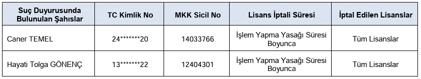 Ceo Event Medya AŞ (CEOEM) ve Pera Gayrı̇menkul Yatırım Ortaklığı AŞ (PEGYO) pay piyasasında gerçekleştirilen işlemleri nedeniyle hakkında suç duyurusunda bulunulmasına karar verilen aşağıdaki tabloda bilgilerine yer verilen şahıslar hakkında, V-101.1 sayılı Bilgi Suistimali ve Piyasa Dolandırıcılığı İncelemelerinde Uygulanacak Tedbirler Tebliği’nin 17/1 maddesi uyarınca sahip olduğu tüm lisansların işlem yapma yasağı süresi boyunca iptal edilmesine karar verildiği açıklandı