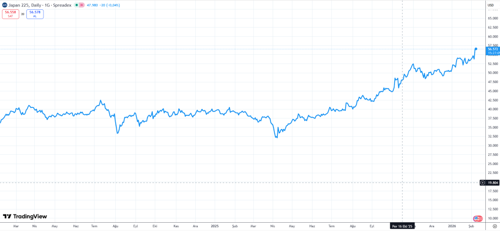 Öğleden sonra, Nikkei 225 endeksi %4,6 artışla 56.729,51 seviyesine ulaşarak ilk kez 57.000 seviyesini aştı ve yeni bir rekor kırdı.