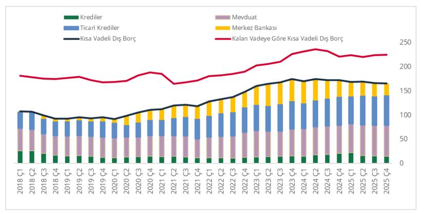 Türkiye Cumhuriyet Merkez Bankası (TCMB), Aralık 2025 dönemine ilişkin Kısa Vadeli Dış Borç (KVDB) istatistiklerini yayımladı. Buna göre, Türkiye’nin KVDB stoku bir önceki çeyreğe kıyasla yüzde 0,3 azalarak Kasım ayı itibarıyla 165,7 milyar ABD doları oldu.