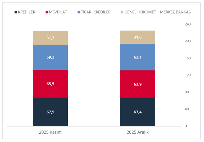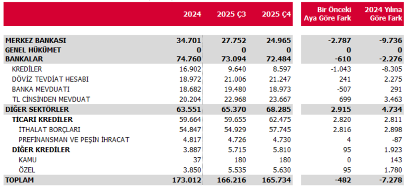 Verilere göre bankalar kaynaklı KVDB stoku, bir önceki çeyreğe göre yüzde 0,8 azalışla 72,5 milyar ABD doları seviyesine indi. Merkez Bankası yükümlülükleri ise yüzde 10 düşüşle 25,0 milyar ABD doları oldu.
