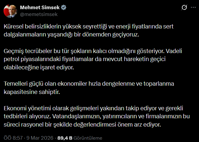 “Geçmiş tecrübeler, bu tür şokların kalıcı olmadığını gösteriyor. Vadeli petrol piyasalarındaki fiyatlamalar da mevcut hareketin geçici olabileceğine işaret ediyor. Temelleri güçlü olan ekonomiler hızla dengelenme ve toparlanma kapasitesine sahiptir. Ekonomi yönetimi olarak gelişmeleri yakından takip ediyor ve gerekli tedbirleri alıyoruz. Vatandaşlarımızın, yatırımcıların ve firmalarımızın bu süreci rasyonel şekilde değerlendirmesi önem arz ediyor.”
