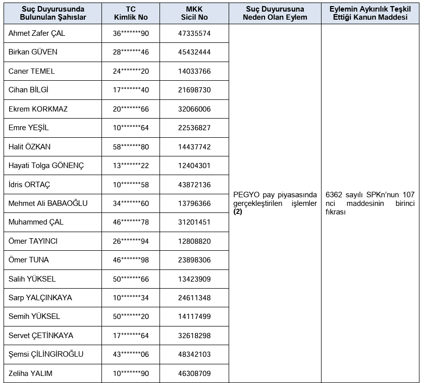 Pera Gayrı̇menkul Yatırım Ortaklığı AŞ (PEGYO) pay piyasasında gerçekleştirilen işlemlerde sorumluluğu bulunan aşağıdaki tabloda yer alan şahıslar hakkında 6362 sayılı Sermaye Piyasası Kanunu’nun (SPKn) 107 nci maddesinin birinci fıkrası kapsamında işlem yapılmak üzere, SPKn’nun 115 inci maddesi uyarınca Cumhuriyet Başsavcılığı’na suç duyurusunda bulunulmasına karar verildiği 4/2026 sayılı bülten ile yayımlandı.