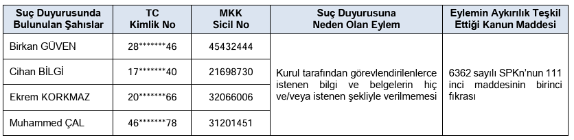 Buna ilave olarak da pek rastlanmayan bir husus da bültende dikkatleri çekti. Dört şahıs hakkında Kurul tarafından talep edilen bilgi ve belgelerin hiç ve/veya istenilen şekilde verilmemesi gerekçesi ile ilave suç duyurusunda bulunulmasına karar verildiği bildirildi.