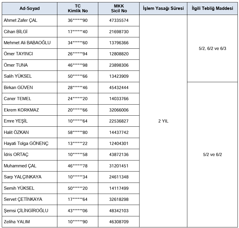 Suç duyurularına ilave olarak da; isimleri piyasada çok iyi bilinen kişiler hakkında suç duyurusuna ilave olarak iki yıl süreli olarak işlem yasağı yaptırımına karar verildiği açıklandı