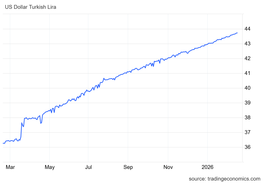 Yurt içi piyasalarda ise Dolar/TL kuru, şubat ayında 43,50 seviyesini görerek tüm zamanların en yüksek seviyesine (rekor düşük TL değeri) ulaştı. Türkiye Cumhuriyet Merkez Bankası’nın (TCMB) “kontrollü devalüasyon” olarak adlandırılabilecek stratejisi ve rezerv yönetimi, kurdaki artış hızını belirlemeye devam ediyor. Geçtiğimiz yıl TL’nin dolara karşı yaşadığı yüzde 20’lik değer kaybı, bu yıl da kademeli olarak sürüyor. TCMB’nin ocak ayında politika faizini 10,5 puan birden indirerek yüzde 37’ye çekmesi, TL üzerindeki baskıyı artıran temel unsurlardan biri oldu. Merkez Bankası, manşet enflasyonun (gıda fiyatları etkisiyle) yüksek kalmasına rağmen, “ana eğilimdeki yavaşlamayı” gerekçe göstererek sıkı para politikasını gevşetme yoluna gitti. Enflasyonun yüzde 31 seviyelerinde katılaşması ve asgari ücrete yapılan yüzde 27’lik zammın enflasyonun altında kalması, hanehalkının alım gücündeki erimeyi derinleştiriyor.