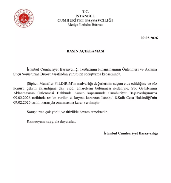 “İstanbul Cumhuriyet Başsavcılığı Terörizmin Finansmanının Önlenmesi ve Aklama Suçu Soruşturma Bürosu tarafından yürütülen 2026/13211 sayılı soruşturma kapsamında, Şüpheli Muzaffer Yıldırım’ın malvarlığı değerlerinin suçtan elde edildiğine ve söz konusu gelirin aklandığına dair ciddi emarelerin bulunması nedeniyle, Suç Gelirlerinin Aklanmasının Önlenmesi Hakkında kanun kapsamında Cumhuriyet Başsavcılığımızca 09.02.2026 tarihinde verilen Resen el koyma kararının, İstanbul 8. Sulh Ceza Hakimliğinin 09.02.2026 tarih ve 2026/885 değişik iş sayılı kararıyla onanmasına karar verilmiştir. Soruşturma çok yönlü ve titizlikle devam etmektedir”