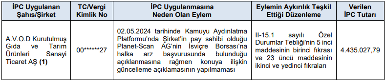 a- ) A.V.O.D Kurutulmuş Gıda ve Tarım Ürünleri Sanayi Ticaret AŞ (Şirket) hakkında yapılan inceleme sonucunda 02.05.2024 tarihinde Kamuyu Aydınlatma Platformu’nda Şirket’in pay sahibi olduğu Planet-Scan AG’nin İsviçre Borsası’na halka arz başvurusunda bulunduğu açıklanmasına rağmen konuya ilişkin güncelleme açıklamasının yapılmaması nedeniyle aşağıdaki tabloda yer alan idari para cezasının uygulanmasına karar verilmiştir