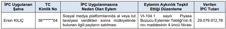 b- ) Ersin KILIÇ adlı şahıs tarafından Borsa İstanbul AŞ pay piyasalarında gerçekleştirilen işlemler ile ilgili olarak yapılan inceleme sonucunda Sosyal medya platformlarında al veya tut tavsiyesi verdikten sonra mülkiyetinde