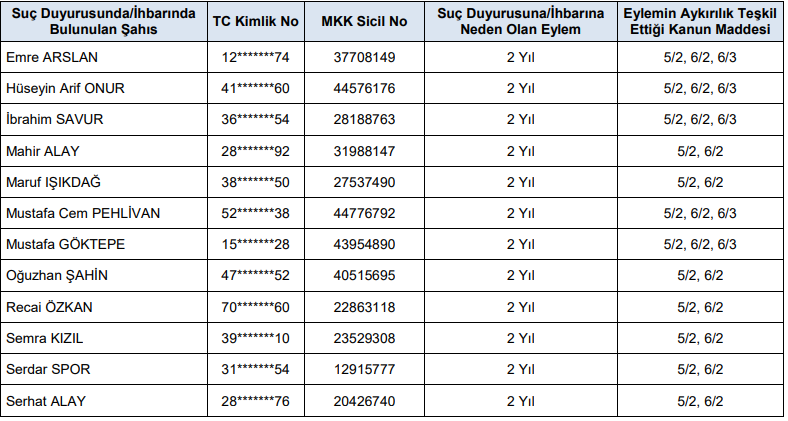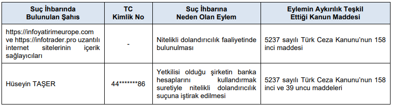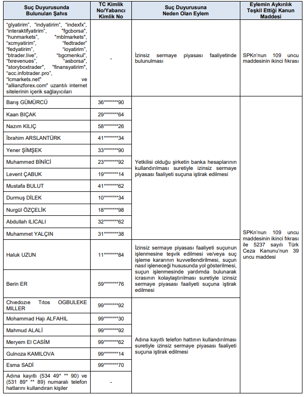 a-) 6362 sayılı Sermaye Piyasası Kanunu ve ilgili mevzuat kapsamında yapılan incelemeler sonucunda, aşağıdaki tabloda belirtilen suç ihbarlarının yapılmasına karar verilmiştir.
