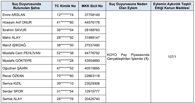 inceleme sonucunda, 6362 sayılı Sermaye Piyasası Kanunu’nun 107/1 maddesinde tanımlanan işlem bazlı piyasa dolandırıcılığı fiilinde sorumluluğu bulunan ve bilgilerine aşağıdaki tabloda yer verilen şahıslar hakkında SPKn’nun 107/1 maddesinde tanımlı “Piyasa Dolandırıcılığı” suçu kapsamında işlem yapılmak üzere, SPKn’nun 115 inci maddesi uyarınca Cumhuriyet Başsavcılığı’na suç duyurusunda bulunulmasına karar verilmiştir. (Bknz. 3. Diğer Yaptırım, Tedbir ve İşlem Yasakları).